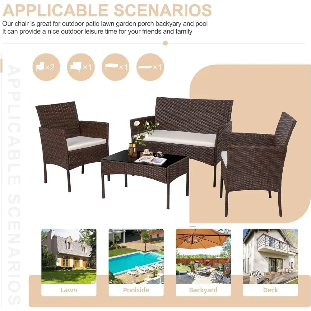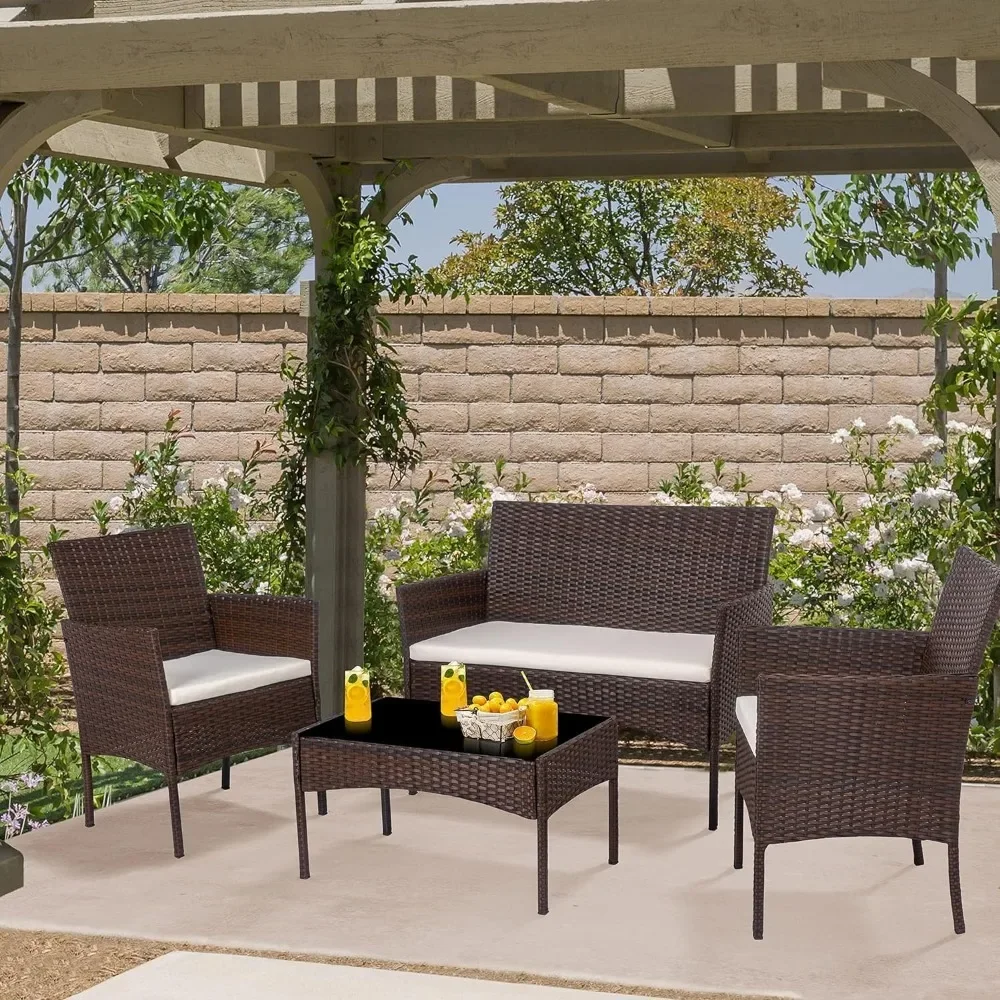 Upgrade your outdoor space with this 4 Piece Outdoor Patio Furniture Set—the perfect blend of style, comfort, and durability. This compact set includes two cozy rattan chairs, a matching loveseat, and a sleek coffee table, all crafted from high-quality, weather-resistant wicker. Designed to provide an inviting atmosphere for intimate gatherings or relaxed solo moments, the furniture set is both stylish and practical, fitting beautifully into small patios, balconies, or garden corners. Whether hosting friends or enjoying a quiet evening, this conversation set is your go-to for creating a serene outdoor retreat.